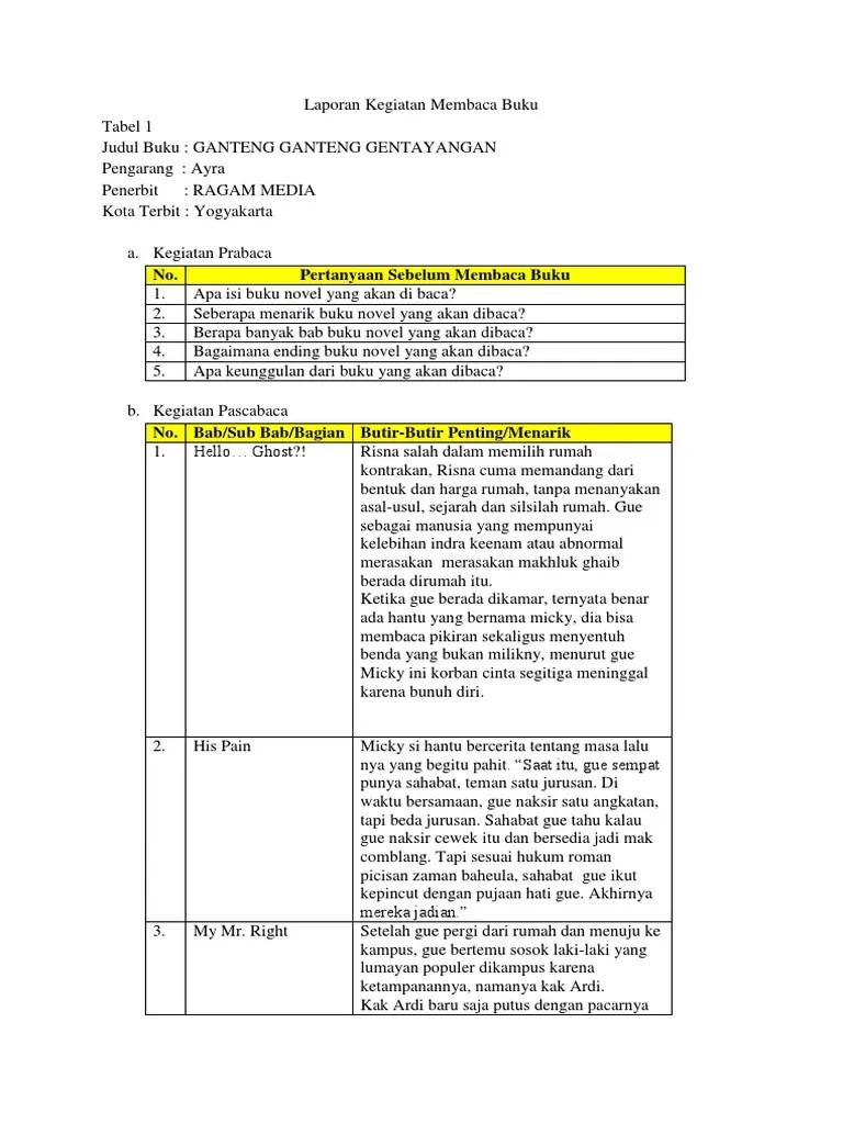 Rud gunawan dan guntur cahyo utomo. Cerita pendek, novelet, dan novel. Laporan kegiatan prabaca a laporan kegiatan prabaca judul buku pengarang penerbit tahun terbit jenis buku tebal buku no 1 pintar mengintip . Pada contoh laporan membaca buku nonfiksi di atas tidak saya cantumkan halamannya. Laporan kegiatan membaca buku nonfiksi.
